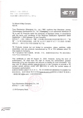 JURMAY在中国大陆代理分销的元器件主要有以下知名品牌:连接器有TE(原TYCO、AMP) 、Molex、JST、 FCI等品牌。接线端子座有德国 PHOENIX、美国HEYCO、台湾DINKLE等品牌。JURMAY目前已成为国内具有相当影响力的连接器分销品牌,在连接器领域JURMAY可以真正为客户提供一站式供应服务,大大提高了客户的采购效率;其中TE连接器是JURMAY在中国区的授权代理品牌。