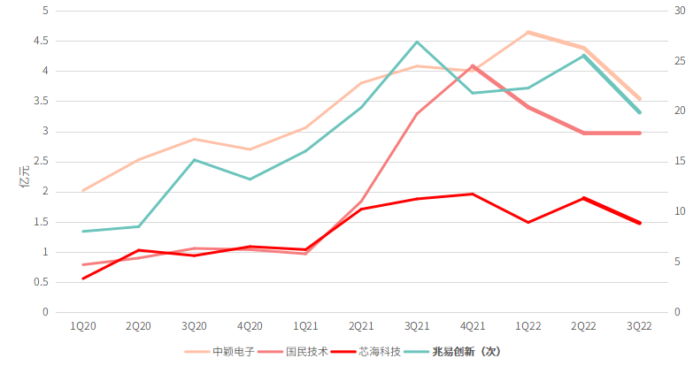 纵观整个2022年的营收,从目前各家企业披露的业绩预告来看,中颖电子全年的营收在3.6~3.8亿元之间,同比变动-2.9~2.5%;国民技术净亏损2300万元至3300万元,由盈转亏;扣非净亏损1.05亿元至1.15亿元,原因是集成电路下游市场需求阶段性萎缩,产品销售价格承压,导致集成电路业务销售收入和毛利同比下降;芯海科技2022年的净利润为1100万元,同比下降88.50%左右。兆易创新虽还未公布全年营收区间,但2022年前三季度实现营收67.69亿元,同比+6.94%,营收增速放缓。