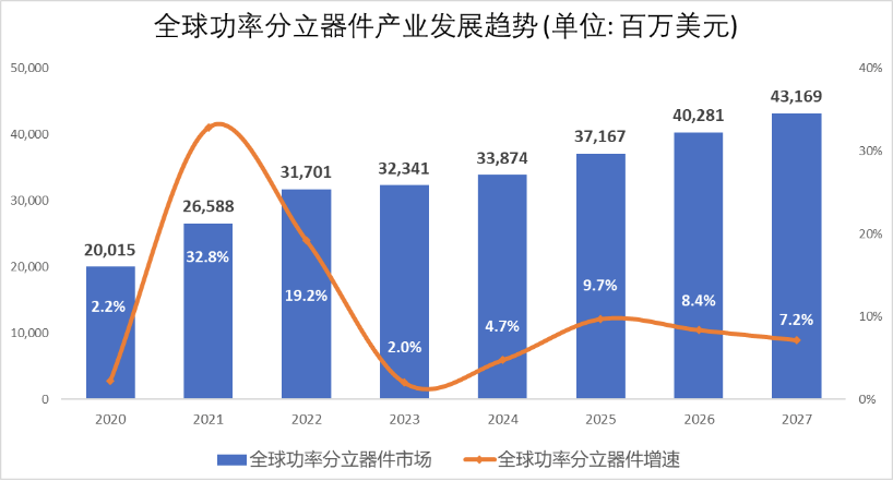 2022年,虽然全球新冠疫情还在继续,但全球功率分立器件市场却迎来了大幅成长,尤其是中国功率分立器件市场,同比增速高达21%。据芯谋研究数据,2022年全球功率分立器件市场规模为317亿美元。其中中国功率分立器件市场营收为134亿美元,全球市场占比为42.2%,占比继续提升。