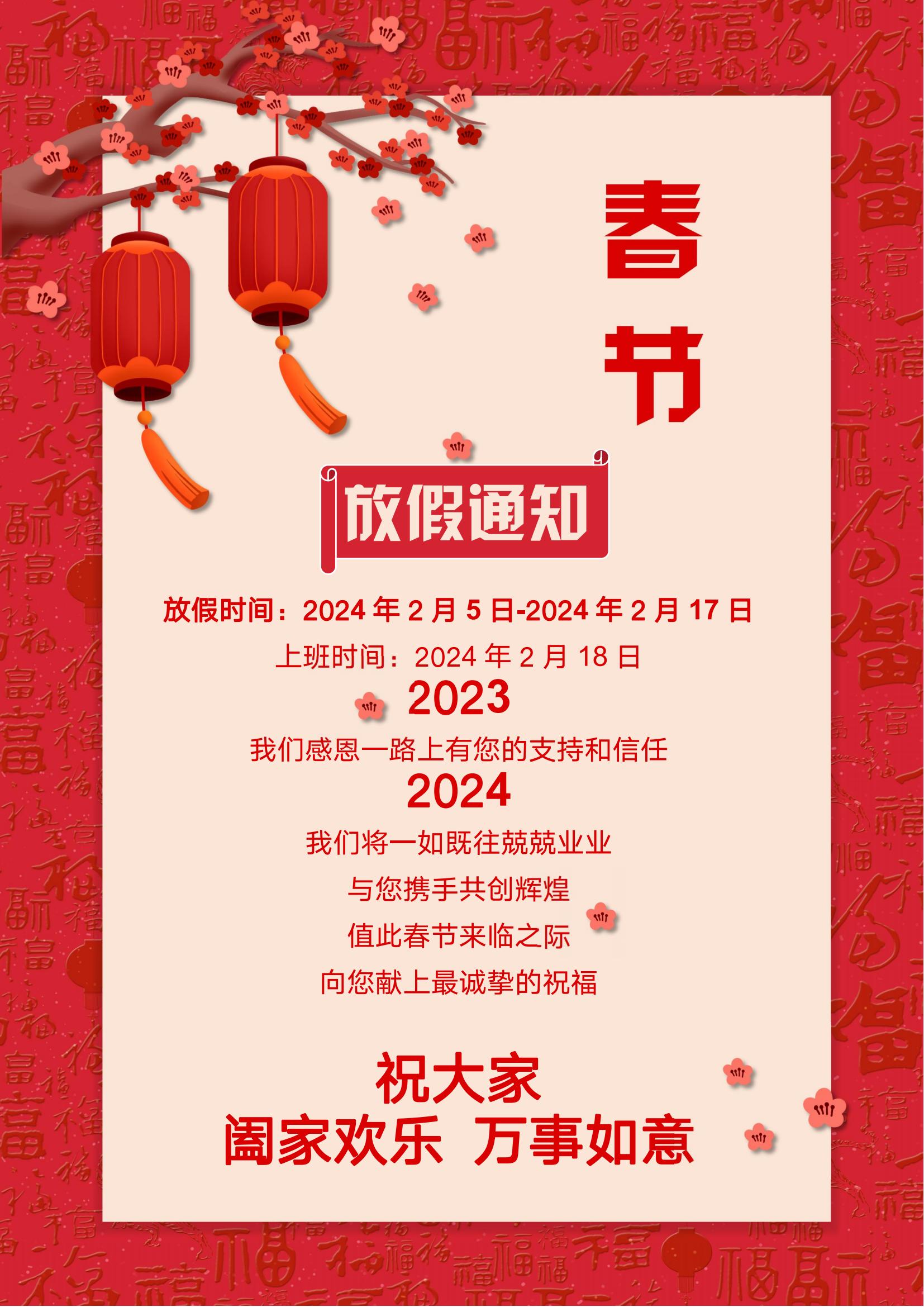 为了不影响节前节后贵司的正常生产运行,请大家在节前提前备料下单或者送货,为新的一年做好奋斗准备。因此给大家带来的不便,敬请谅解!